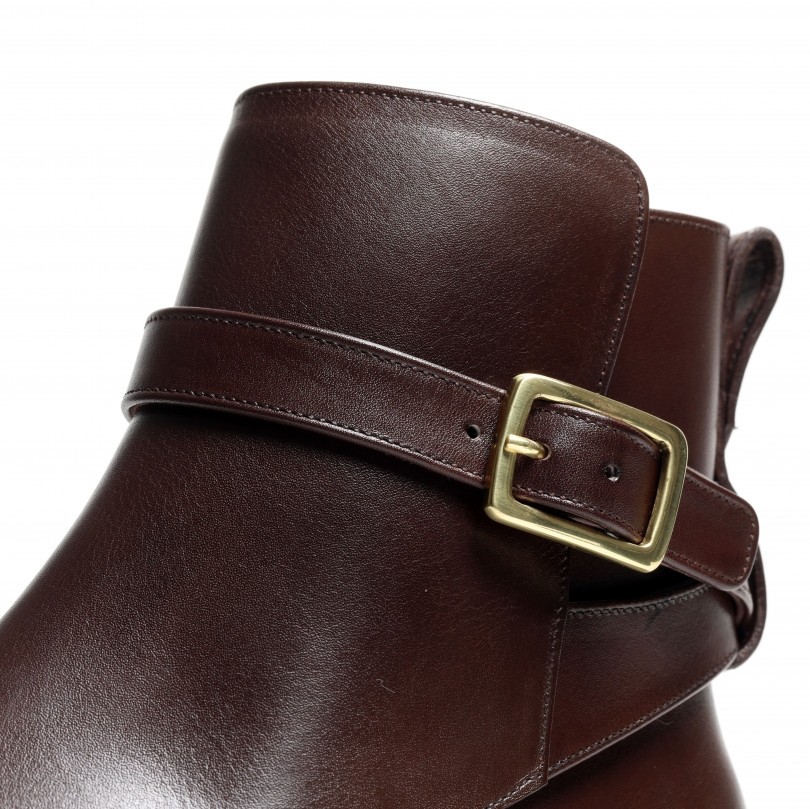 「革自体は肌色に近い薄茶色なんですが、何度もパティーヌを重ねることによって、この深いブラウンを表現しています。しかも革の色に合わせて、金具を真鍮に。とにかく手間と時間が掛かるので、12足作るのが精一杯だったんです」