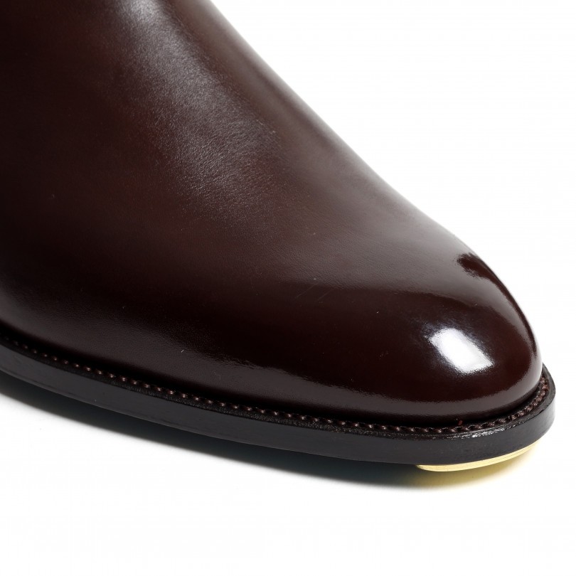 「オリジナルのブラックはアノネイ社のヴェガーノという革を採用しています。でもブラウンというのは、ブラックと違ってタンニンが強い。ヴェガーノをブラウンに染めようとすると、履き込んだときのシワの表情がとても硬い印象になってしまうんですね。そこで、タンニンがありつつもクロームの比率が高い、デュプイ社のカーフに変更することにしました。そのほうがイメージ通りの、赤みのあるエレガントなブラウンに近づけられるという確信があったので。結果として、狙い通りのいい色に仕上がったと思います。色別注ではあったのですが、実は勝手に革別注にしてしまったんですよ(笑)」