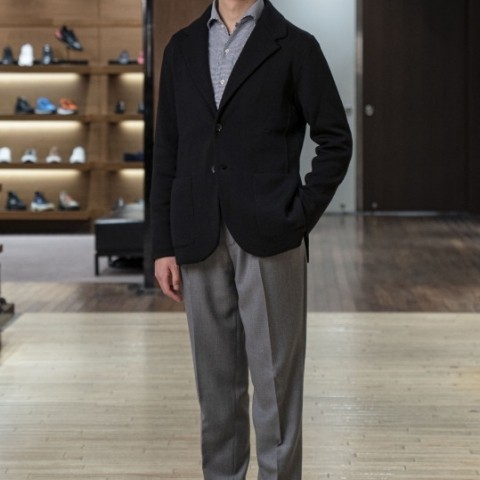 リラックスしたニットジャケットに、グレーのドローコード付きイージーパンツというモノトーンのカジュアルな組み合わせ。インナーは遠目に無地のシャツだが、じつはマイクロ千鳥格子のワンピースカラー。襟元がほどよく開くワンピースカラーは、タイドアップもできるので、カジュアルOKの職場ならこのまま出社もできるだろう。その際、履き心地も軽やかなスニーカータイプのプレーントゥならオフィスエレガンスも保つことができるうえ、ラフになり過ぎないようスタイリングを引き締めてくれる。