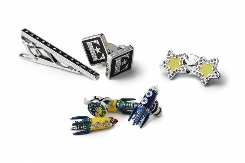 このコレクションでは“ロケットマン”をメインモチーフに、“動きのあるデザイン”というタテオシアンのブランドコンセプトを踏襲。多様化する現代のニーズに合わせて、紳士向けのタイバー、ユニセックスで使えるピンズ、エルトンのアイコンともなっている星型サングラスをモチーフにしたもの、イニシャルであるEをあしらったものなど、ステータス性の高いものを取り揃えているという。