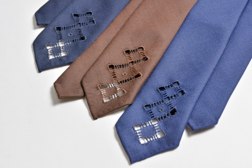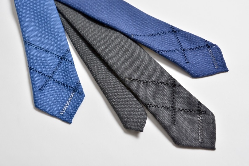 なかでも、伝統的なフィレンツェの手刺繍を取り入れたネクタイは、大剣に施された模様が特徴。生地にあけられた穴は、糸を一本一本手作業で抜く“糸ぬき”によるもので、世界でも限られた職人のみが持つ技術だ。