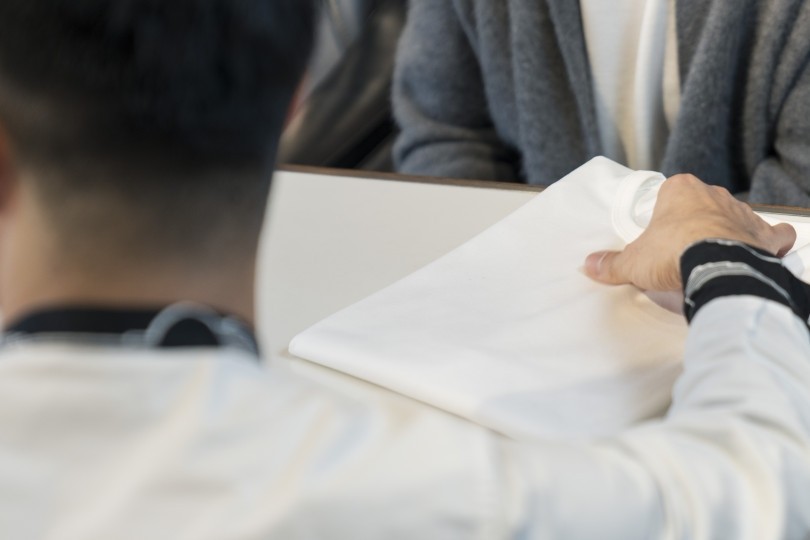 「植松さんに提案した糸はインドの超長綿マハバーラ。手摘み収穫されるので油分が残り、美しい光沢としなやかな手触りが特徴です。これを100番手の双糸に紡績してからハイゲージスムースに編み立てて、シルケット加工を施しています。薄手ですが透けにくく、伸縮性も高いので着心地も良いものが出来ました。工場も会社名も、すべてリーフレットに明記してあります」。