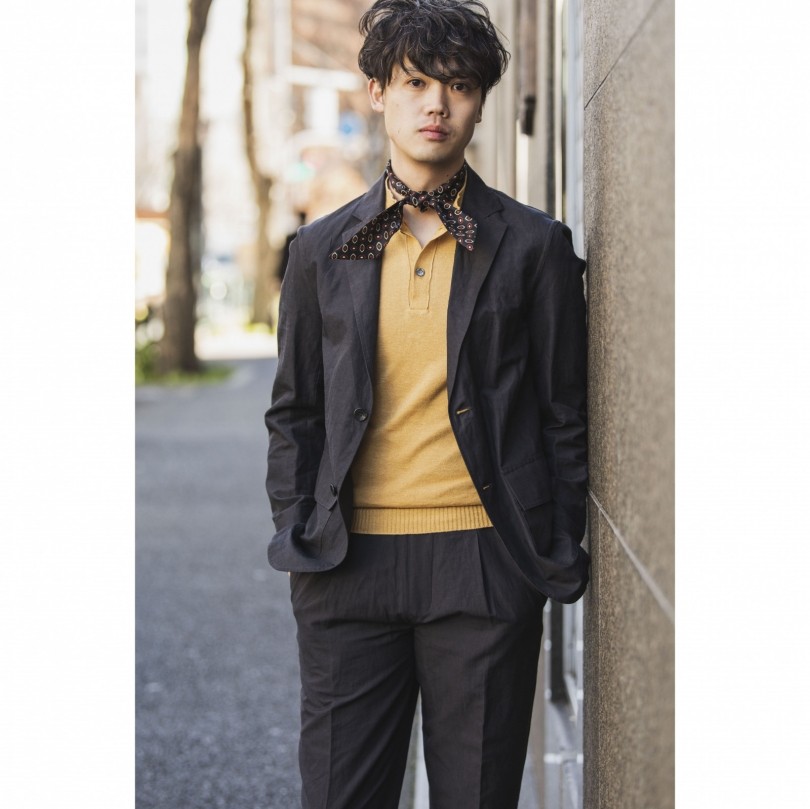 毎シーズン個性的な素材使いと、クラシックなテーラリング技術を用いたモダンスタイルでメンズスタイルをリードする<THE GIGI/ザ ジジ>。今回はリネンとコットンの混紡生地のスーツに、ニットポロを合わせるコーディネートで、カジュアルスタイリングを提案。上掲に倣い、スカーフを巻くことで、大人のアクセサリー使いもプラス。足元はドレススリッポンとして、いま人気の高い<Baudoin & Lange/ボード イン アンド ランジ>のベルジャンシューズを合わせることで、ラグジュアリーカジュアルを意識したコーディネートに仕上げている。