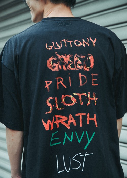 〈ヴェトモン〉らしい特徴的なグラフィックと程よいビックシルエットが心地良い。背面の7つの大罪それぞれが異なる字体と配色になっていて、細部までデザインが凝っている点がお気に入りです。