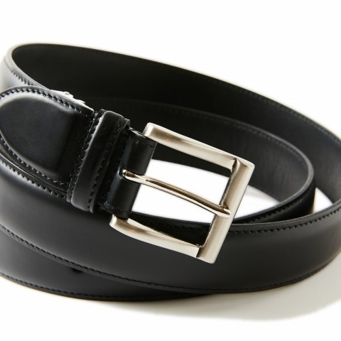 黒の牛革で、マット(艶のない)でシンプルなシルバーバックルのものにしましょう。ネイビースーツであっても、ベルトは靴と合わせて黒色がベストです。