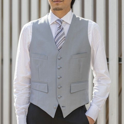 フォーマルな場面では上の写真のようなグレーのベストをスーツの中に着用する方が好ましいです。グレーのベストなら黒でも紺のスーツでもOKで、紺のスーツの場合は紺のベストでスリーピースとして合わせても素敵です。ベストの一番下のボタンは開けるのがフォーマルのルール。写真のようなシングルタイプでも、ダブルブレストでも着用可能です。