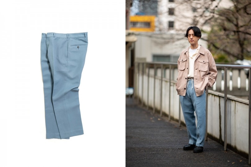 21SSの新型「POLY WORK PANTS」は、ワークパンツといった面持ちだが、トラウザーの様な印象に寄せたデザインが特徴。ドレス的な要素をもつ仕様とデザインを、備後地区特有の力強いミシンで表現するという<サバイ>らしい組み立てのもと生み出された一本は、ハイウエストで9分丈ほどでの着用がおすすめだ。