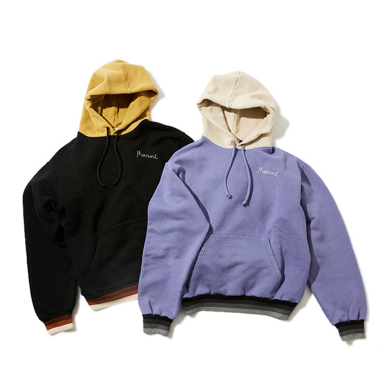 <マルニ>のロゴファンが注目するスウェットシャツとパーカーが登場。ドローストリング付きのフードがおしゃれなフーディーは、春に映える色鮮やかなブルーもポイント。