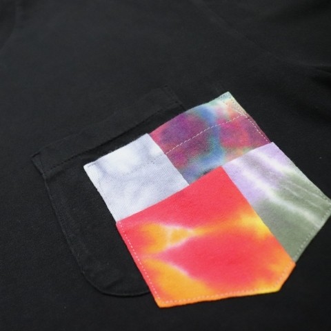 輸入古着のタイダイT シャツをポケットパーツにパッチワークリメイクして取り付けたTシャツ。パッチワークはアソートになります。
