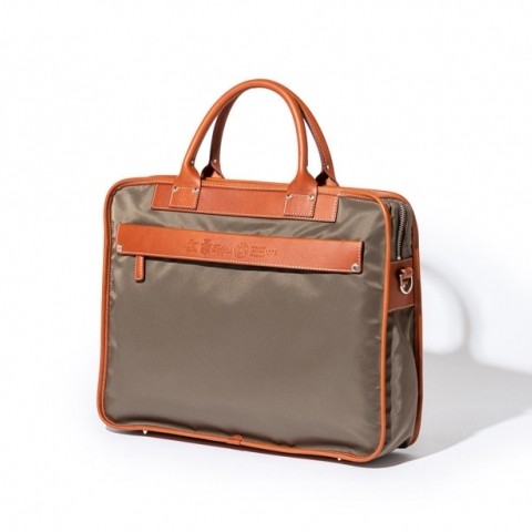ナイロン×レザーのコンビのバッグを購入したら、まず、馬毛などのブラシでナイロン部分を丁寧にブラッシングして、製造・輸送時などに付いた目に見えないレベルのホコリを払います。次に、水分でシミにならないように、防水スプレー「プロテクターアルファ」を全体にかけます。