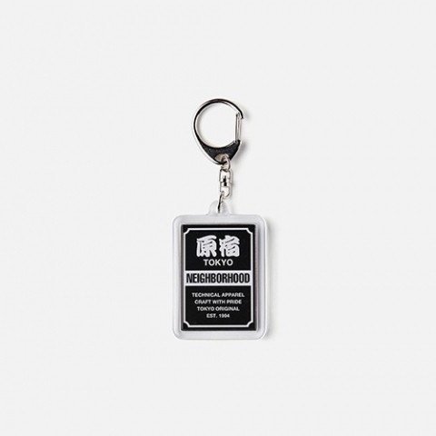 ロゴをプリントしたレクタングルタイプ、ラウンドタイプのプラスチック製キーホルダー。各3色展開。