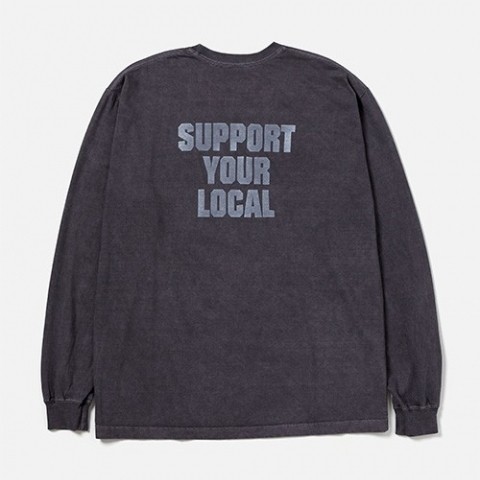 コットン天竺のオリジナルボディーに、ピグメントダイ加工を施したロングスリーブTシャツ。ロゴとテキストをラバープリント。