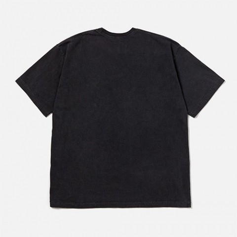 コットン天竺のオリジナルボディーに、ピグメントダイ加工を施したショートスリーブTシャツ。ロゴとスカルモチーフをラバープリント。