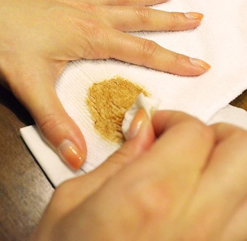 ③シミ部分をつまみあげながら、指先もしくはよく絞ったハンカチやタオルで汚れを落とします。