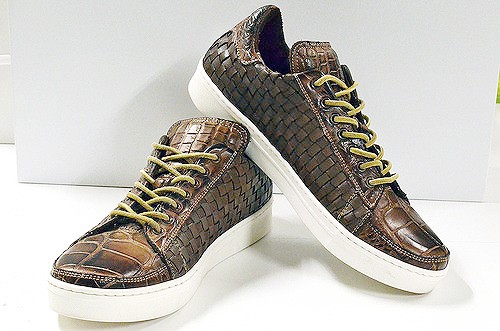 足元にはワニ革と編みこんだヤギ革のイントレチャートを組み合わせたラグジュアリーなスニーカーを…。