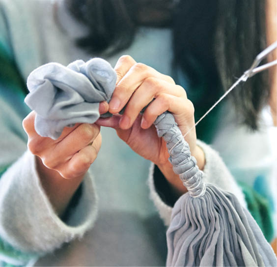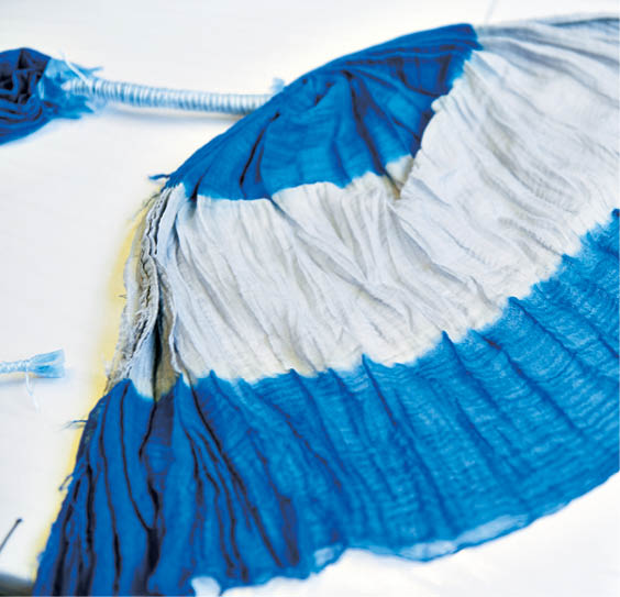 たたみシワをつけてから、染まってほしくない部分をビニールで覆う「帽子絞り」。熱に強いビニールハウス用の素材を用いる。これがなかった頃は、竹の皮を巻いていたという。