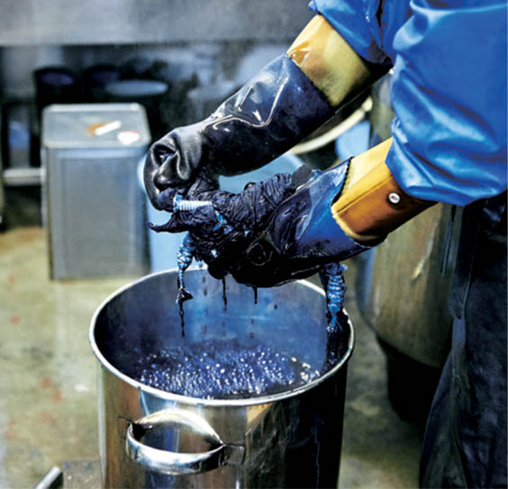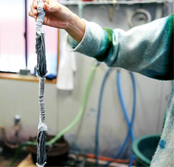 染料が入り込まないように、固く絞っている。職人の頭のなかには、このときすでに完成形がイメージできている。