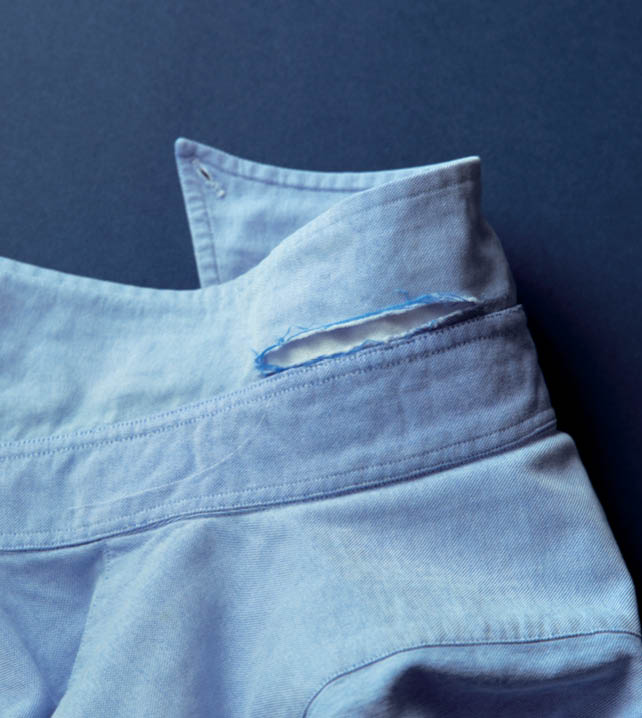 マークス氏が着用しているボタンダウンシャツ。衿は裏面をひっくり返して、お直ししたもの。擦り切れた衿裏に、長く愛するという姿勢を感じ取れる。