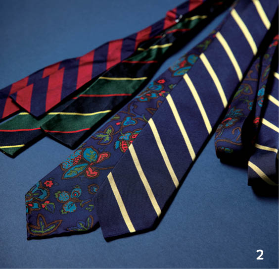 2. ボウタイもレジメンタルストライプのものを愛用。プリントのネクタイは、今の時代を感じさせるハズシ役として機能する。
