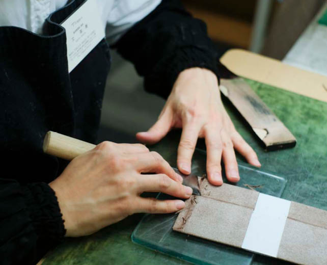 コバ磨きも手作業で行う。丁寧に磨き込んだコバに独自開発の蝋を熱コテで何度も擦り込み、艶のある表情に。