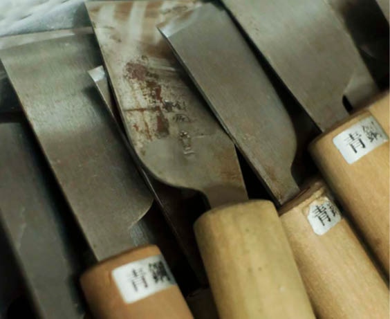 “葉合せ”は1日3回砥ぐ革包丁でしかできない斜め漉きの技術があるからこそ完成した製法。毎日約30本使うため、道具箱の中には包丁がずらり。