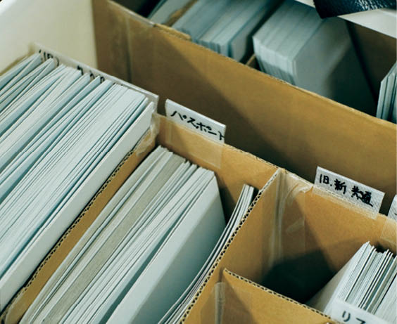 厚紙でつくった型紙は製品をつくるたびに破棄するため大量にストック。