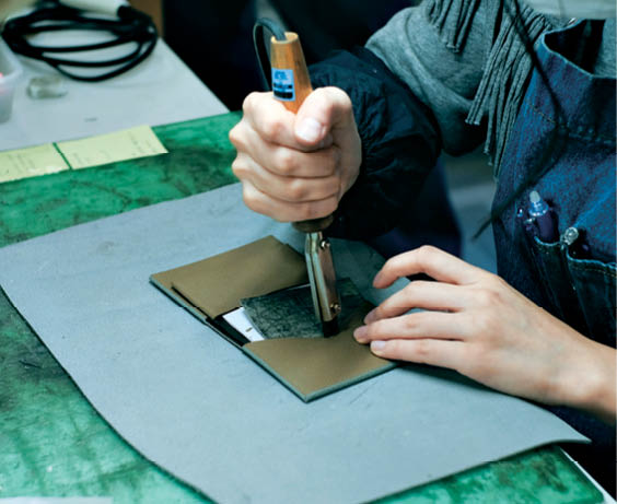 T・MBHの“葉合せ製法”の工程。封筒状に組み立てる際に貼り合わせ部分がわからないように糊代になる革を斜め